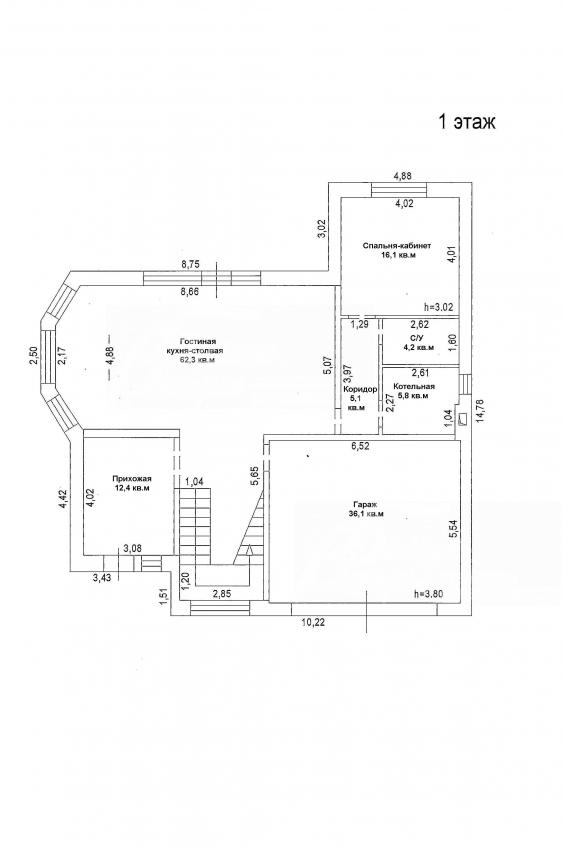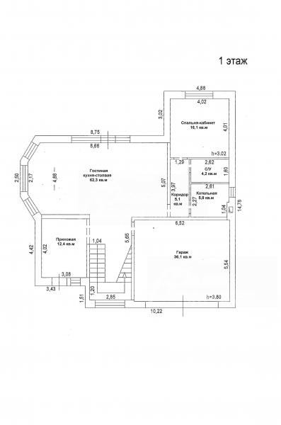 1-ый этаж: холл-прихожая 12.4 кв.м, гостиная кухня-столовая 62 кв.м, коридор 5 кв.м, спальня-кабинет 16 кв.м, с/узел 4 кв.м, гараж 36 кв.м, котельная 5.8 кв.м