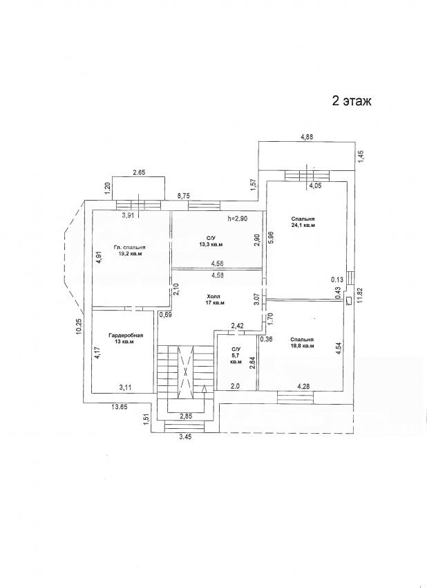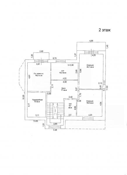 2-ой этаж: холл 17 кв.м, спальня 18.8 кв.м, спальня 24 кв.м, с/узел 5.7 кв.м, главная спальня 19 кв.м с санузлом 13 кв.м и с гардеробной 13 кв.м