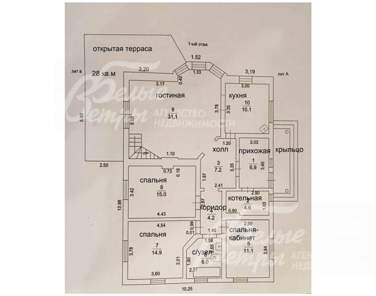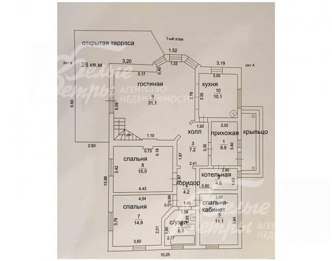 1-ый этаж: Крыльцо, прихожая 7 кв.м, холл 7 кв.м, коридор 4 кв.м, котельная 4.6 кв.м, спальня-кабинет 11 кв.м, 2 спальни по 15 кв.м, санузел 6 кв.м, кухня 10 кв.м, гостиная 31 кв.м с выходом на открытую террасу 28 кв.м.
