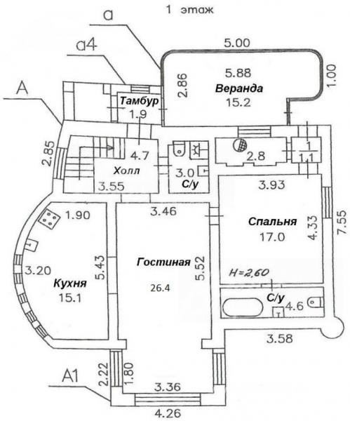 1-ый этаж: тамбур, застекленная веранда 15 кв.м, прихожая 4.7, с/узел, кухня-столовая 15 кв.м с эркером, гостиная 26 кв.м, спальня 17 кв.м со своей ванной комнатой; котельная