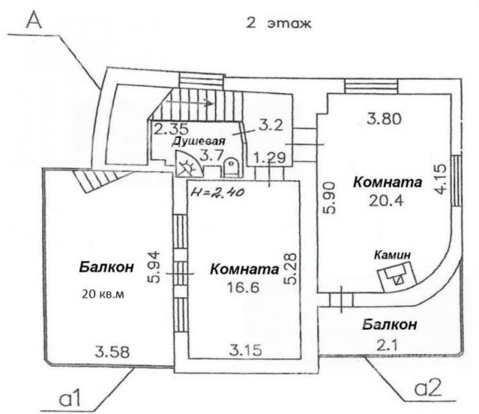 2-ой этаж: жилая комната с камином 20 кв.м с балконом 7 кв.м, душевая, спальня 16.6 кв.м с балконом-террасой 20 кв.м, с террасы есть выход на эксплуатируемую кровлю 60 кв.м с установленным камином-барбекю