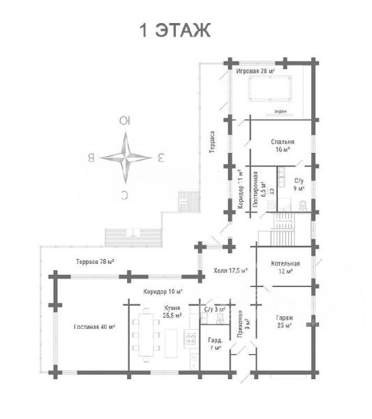 1-ый этаж: прихожая 8,7 кв.м, гардеробная 7 кв.м, холл 17,6 кв.м, лестничный холл 8,7 кв.м, кухня-столовая 35 кв.м, гостиная с камином 35 кв.м, коридор 11,2 кв.м, гостевая мастер спальня 16 кв.м с санузлом 9 кв.м, игровая комната (бильярдная) 26 кв.м, постирочная 6,6 кв.м, гостевой санузел 3 кв.м, котельная 12 кв.м, гараж на 1м/м 25 кв.м. Терраса по периметру дома 78,2 кв.м