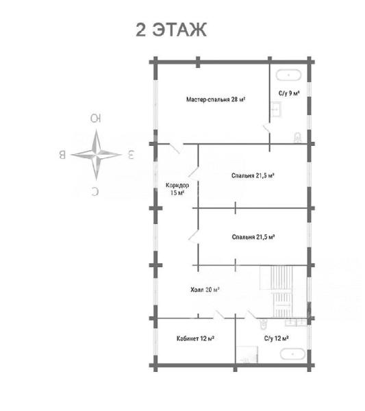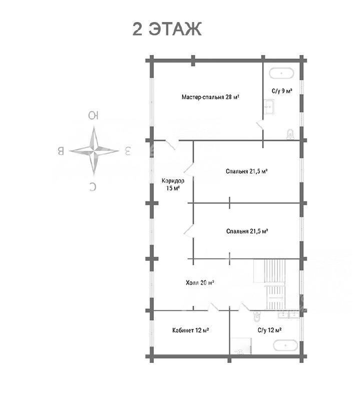 2-ой этаж: холл 20 кв.м, мастер спальня 26,6 кв.м с ванной комнатой 8,5 кв.м, две детские спальни по 21,5 кв.м, санузел общий 11,7 кв.м, кабинет 11,7 кв.м.