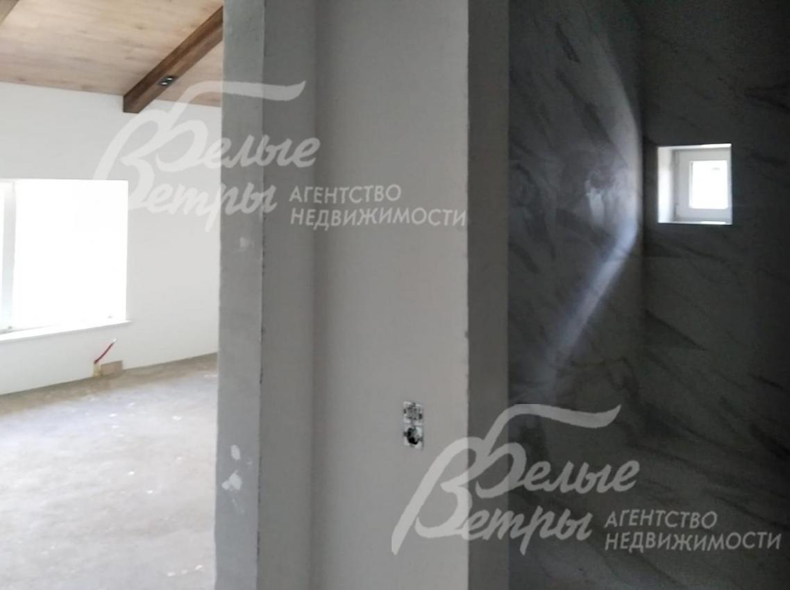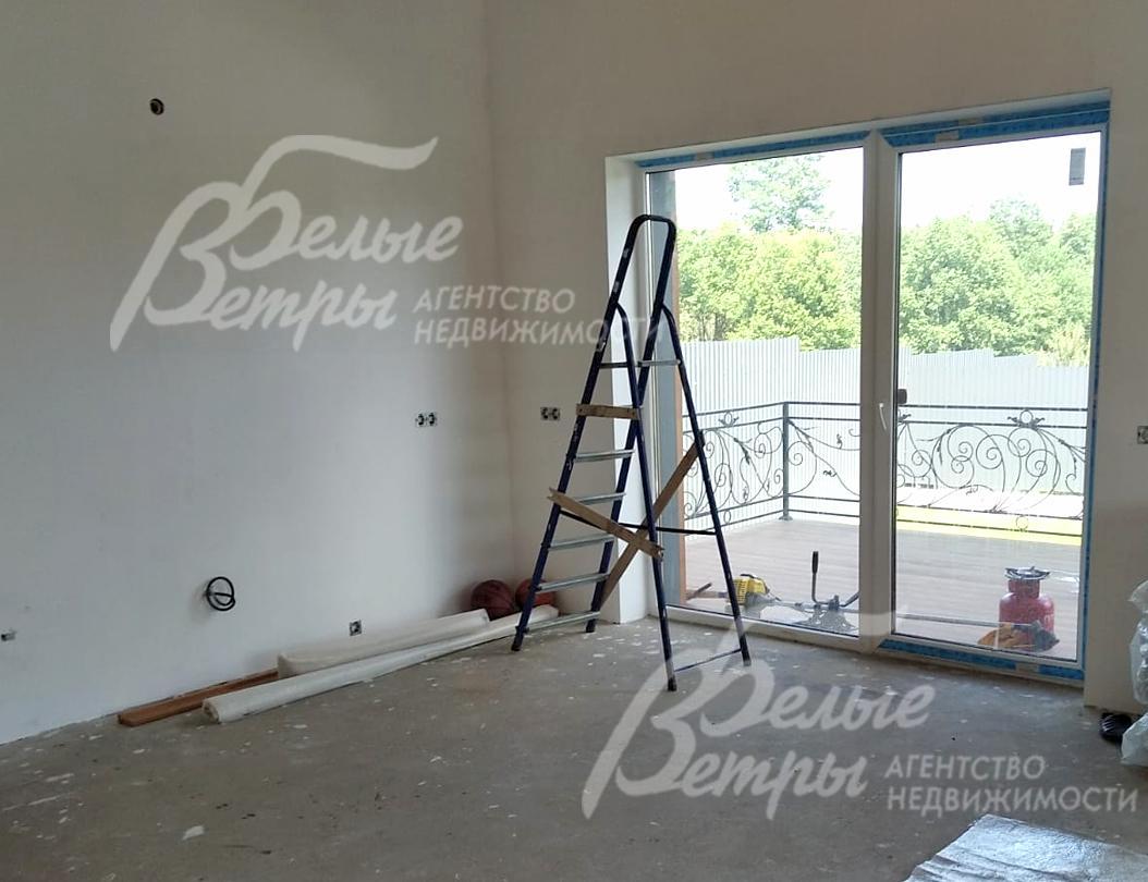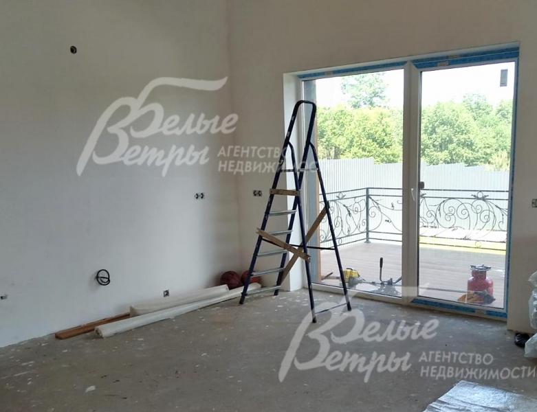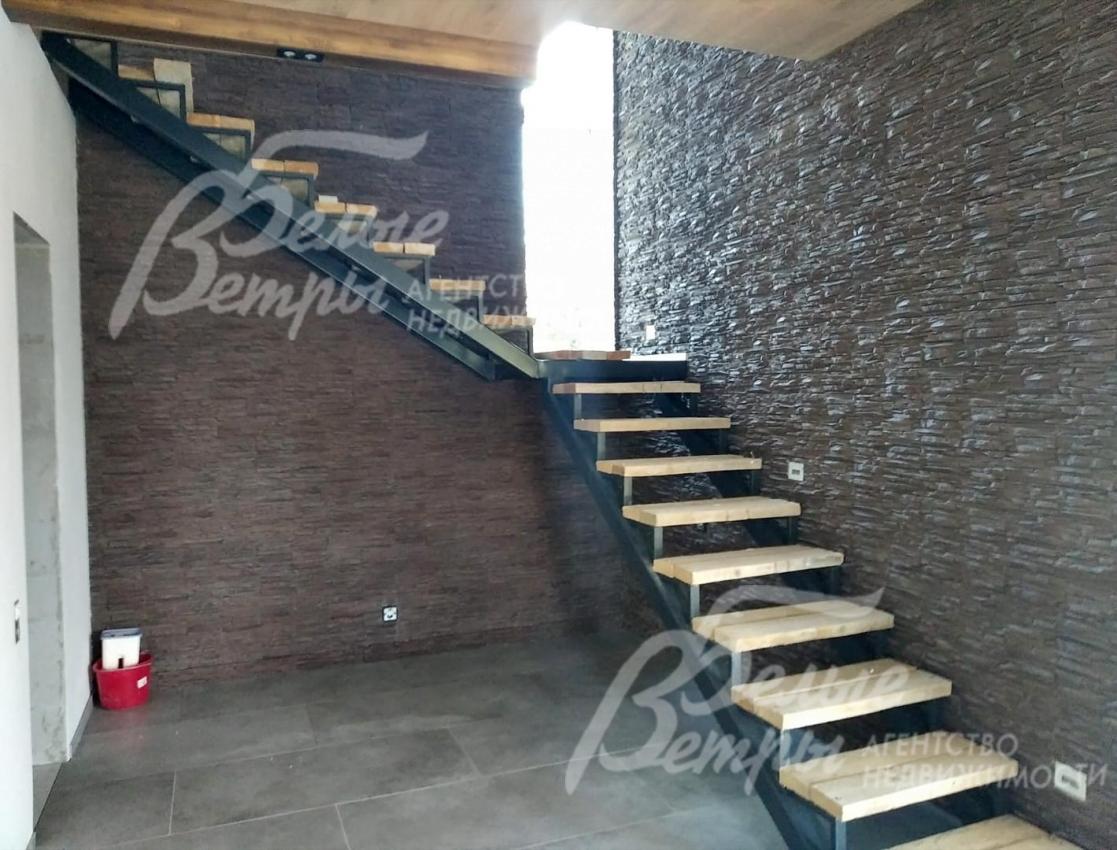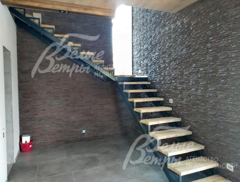 Описание внутренней отделки: дом – под чистовую отделку: межкомнатные перегородки возведены, стены оштукатурены, выровнены и подготовлены для оклейки обоями, потолки из гипсокартона, на полу 1-го этажа и во всех санузлах – плитка с тёплым полом, на полу 2-го этажа – ламинат, установлены межкомнатные шпонированные двери и подоконники ПВХ. На второй этаж ведёт лестница на стальном каркасе