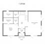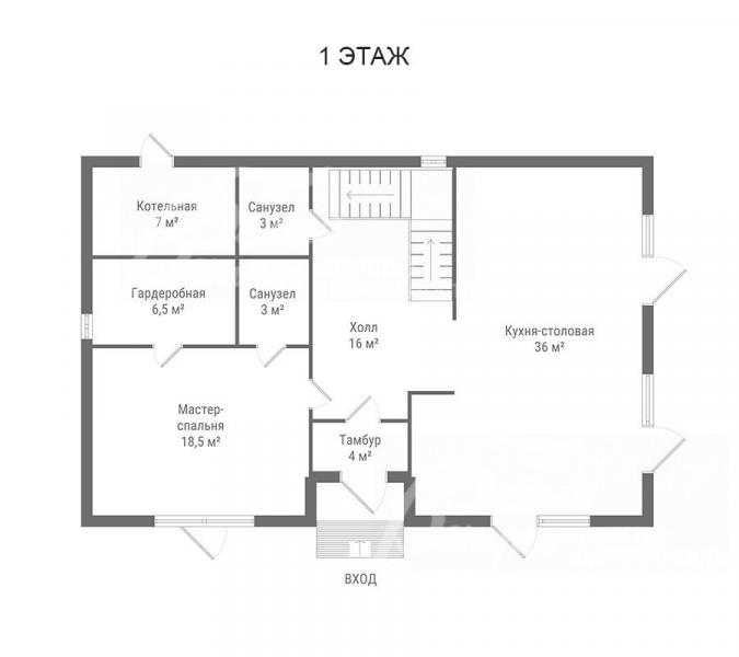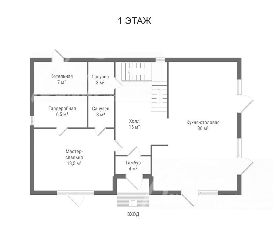 1-ый этаж: тамбур 4 кв.м, холл 16 кв.м, кухня-столовая 36 кв.м с выходом на террасу 45 кв.м, мастер-спальня 18,5 кв.м с санузлом 3 кв.м и гардеробной 6,5 кв.м, санузел 3 кв.м, котельная 7 кв.м с отдельным входом