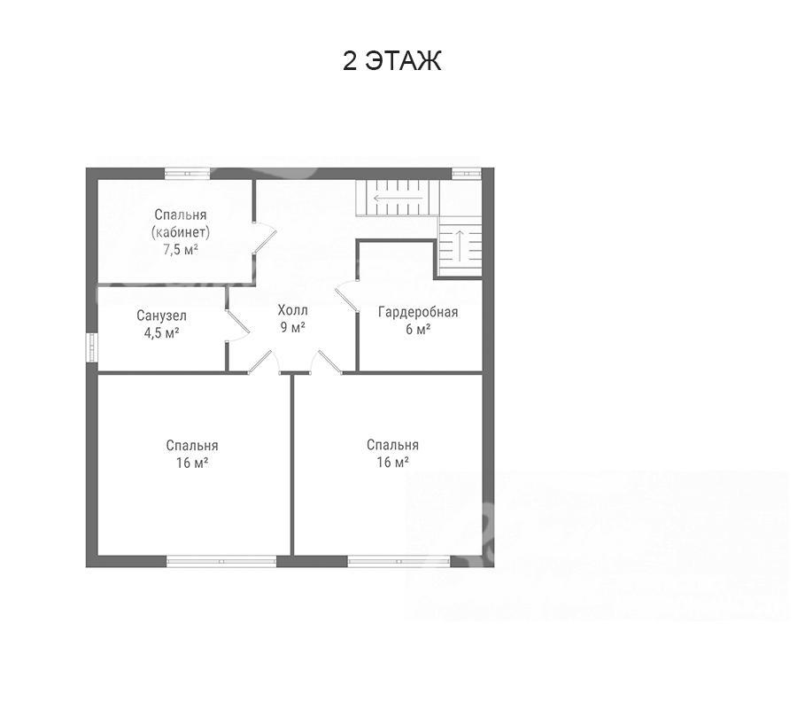 2-ой этаж: холл 9 кв.м, спальня 16 кв.м, спальня 16 кв.м, спальня (кабинет) 7,5 кв.м, гардеробная 6 кв.м, санузел 4,5 кв.м