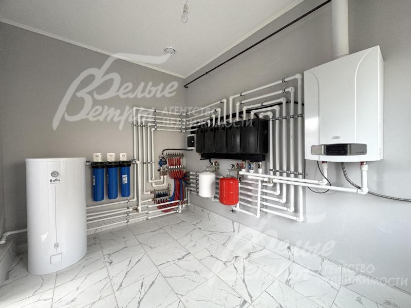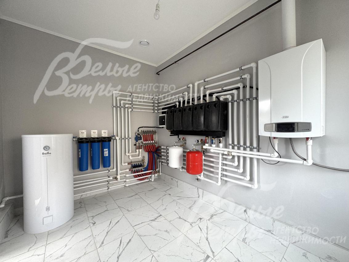 Инженерное обеспечение: коммуникации разведены до точек потребления. Система отопления оснащена котлом Baxi Luna 3 мощностью 31–33 кВт, система горячего водоснабжения — бойлером косвенного нагрева Ballu объёмом 200 л. Также установлена система очистки воды. В мокрых помещениях предусмотрена принудительная вентиляция
