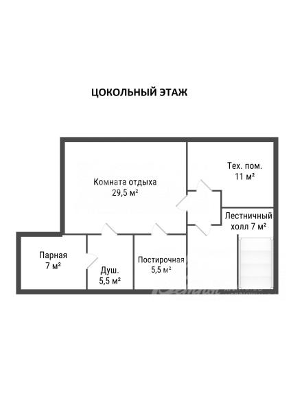 Цоколь: лестничный холл 7 кв.м, парная 7 кв.м, душевая 5,5 кв.м, комната отдыха 29,5 кв.м, постирочная 5,5 кв.м, техническое помещение 11 кв.м