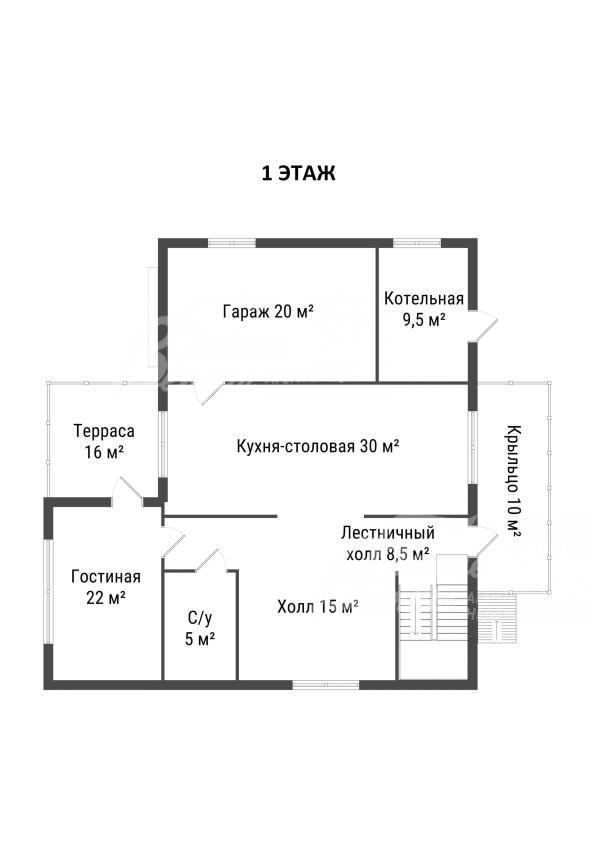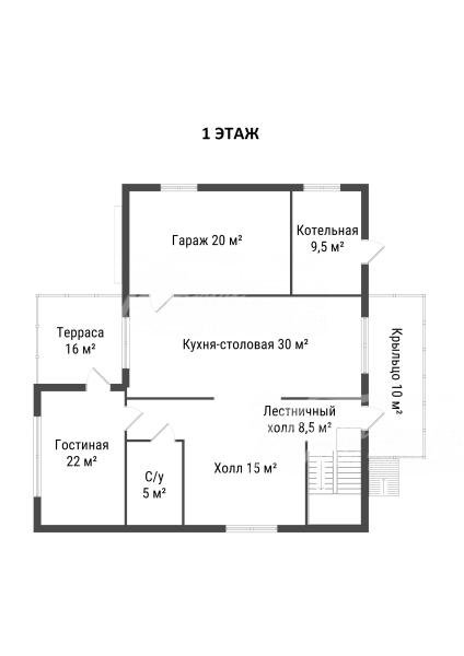 1-ый этаж: крыльцо 10 кв.м, холл 15 кв.м, гостиная 22 кв.м выходом на террасу 16 кв.м, кухня-столовая 30 кв.м, лестничный холл 8,5 кв.м, санузел 5 кв.м, котельная 9,5 кв.м с отдельным входом, гараж 20 кв.м