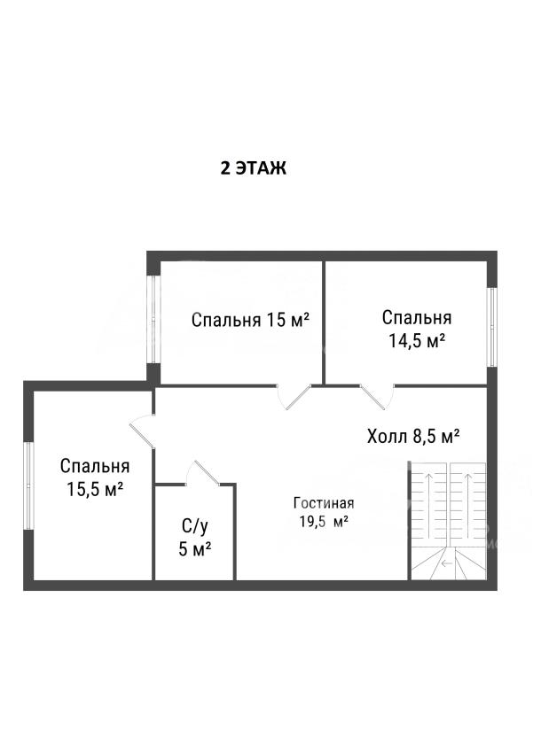 2-ой этаж: лестничный холл 8,5 кв.м, гостиная 19 кв.м, спальня 15,5 кв.м, спальня 14 кв.м, спальня 15 кв.м, санузел 5 кв.м