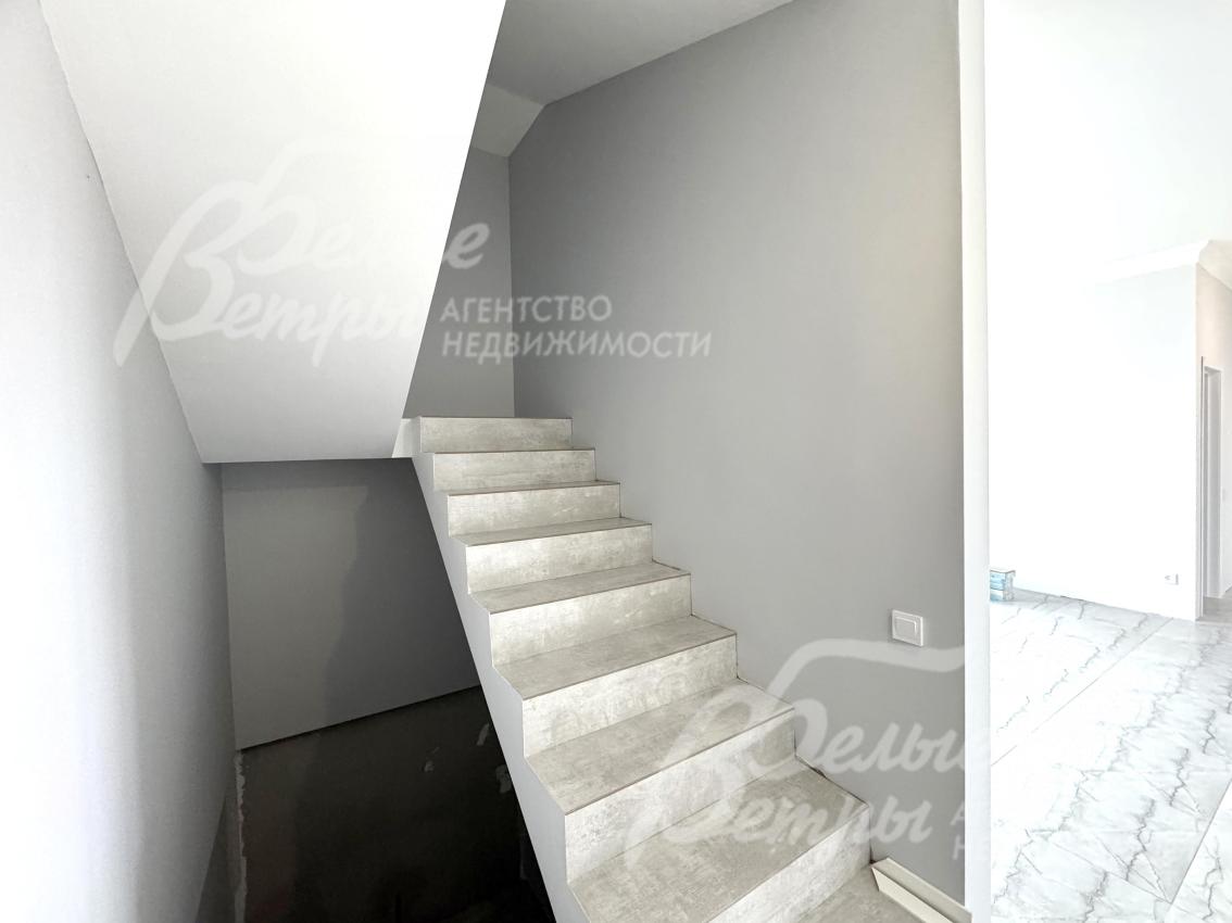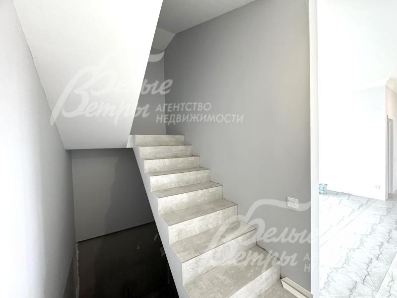 Описание внутренней отделки: в доме выполнена современная отделка в светлых тонах: стены окрашены, на полу уложена плитка с системой тёплых полов и ламинат, потолки окрашены. Установлены белые лаковые межкомнатные двери высотой 2 м. На второй этаж ведёт железобетонная лестница, ступени которой отделаны плиткой