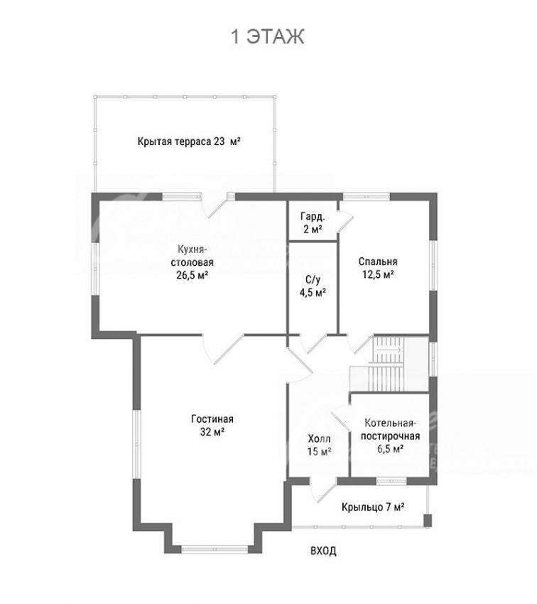1-ый этаж: крыльцо 7 кв.м, холл 15 кв.м, гостиная 32 кв.м, кухня-столовая 26,5 кв.м с выходом на крытую террасу 23 кв.м, спальня 12,5 кв.м с гардеробной 2 кв.м, санузел 4,5 кв.м, котельная-постирочная 6,5 кв.м