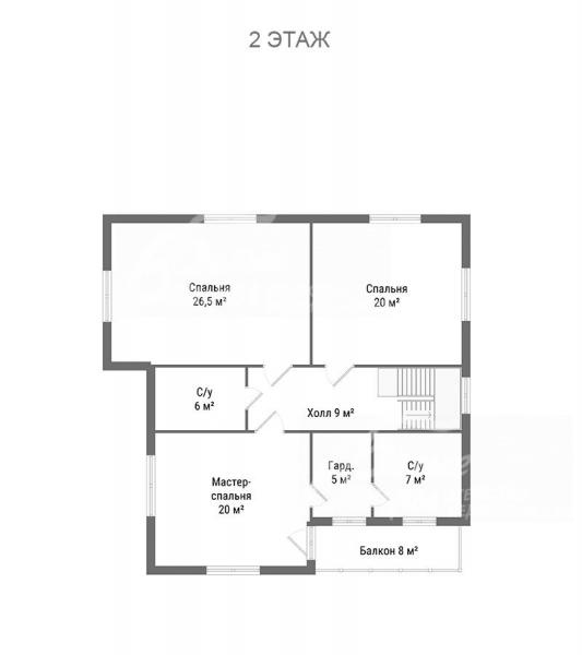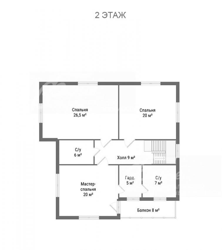 2-ой этаж: холл 9 кв.м, мастер-спальня 20 кв.м с балконом 8 кв.м (вид на лес), гардеробной 5 кв.м и санузлом 7 кв.м, спальня 26,5 кв.м, спальня 20 кв.м, санузел 6 кв.м
