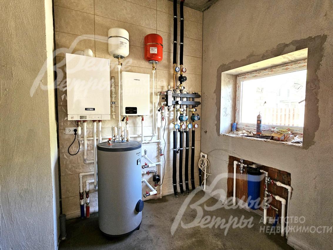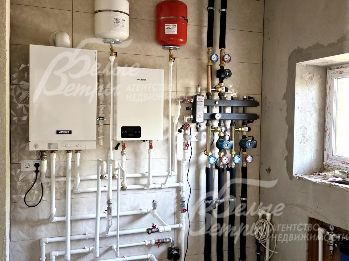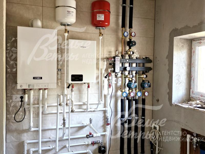 Инженерное обеспечение: заведены вода, электричество и газ, электрика и мокрые коммуникации (мокрые зоны) разведены до точек. Отопление – через газовый настенный котёл Viessmann Vitopend 100 (также есть резервный электрический котёл): обвязка из металлопластика. Горячее водоснабжение – через накопительный бойлер. Есть система грубой очистки воды