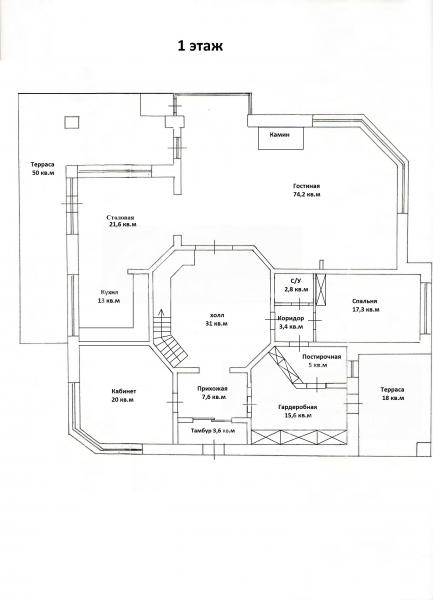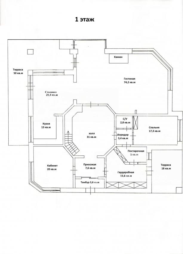 1-ый этаж: Тамбур, прихожая 7.6 кв.м, холл 31 кв.м, кабинет 20 кв.м, кухня 13 кв.м, столовая 21.6 кв.м, гостиная 74 кв.м, спальня 17 кв.м, постирочная 5 кв.м, гардеробная 15.6 кв.м, с/узел 3 кв.м, коридор 3.4 кв.м, терраса 50 кв.м, терраса 18 кв.м.