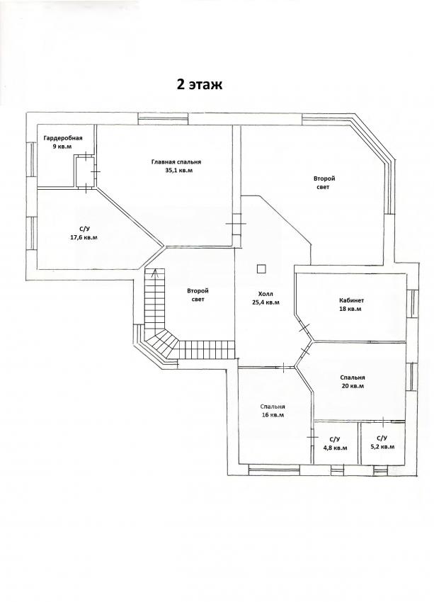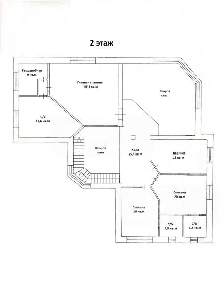 2-ой этаж: Спальня 16 кв.м, спальня 20 кв.м, кабинет 18 кв.м, холл 25.4 кв.м, два санузла 5 кв.м, главная спальня 35 кв.м, гардеробная 9 кв.м, с/узел 17.6 кв.м.