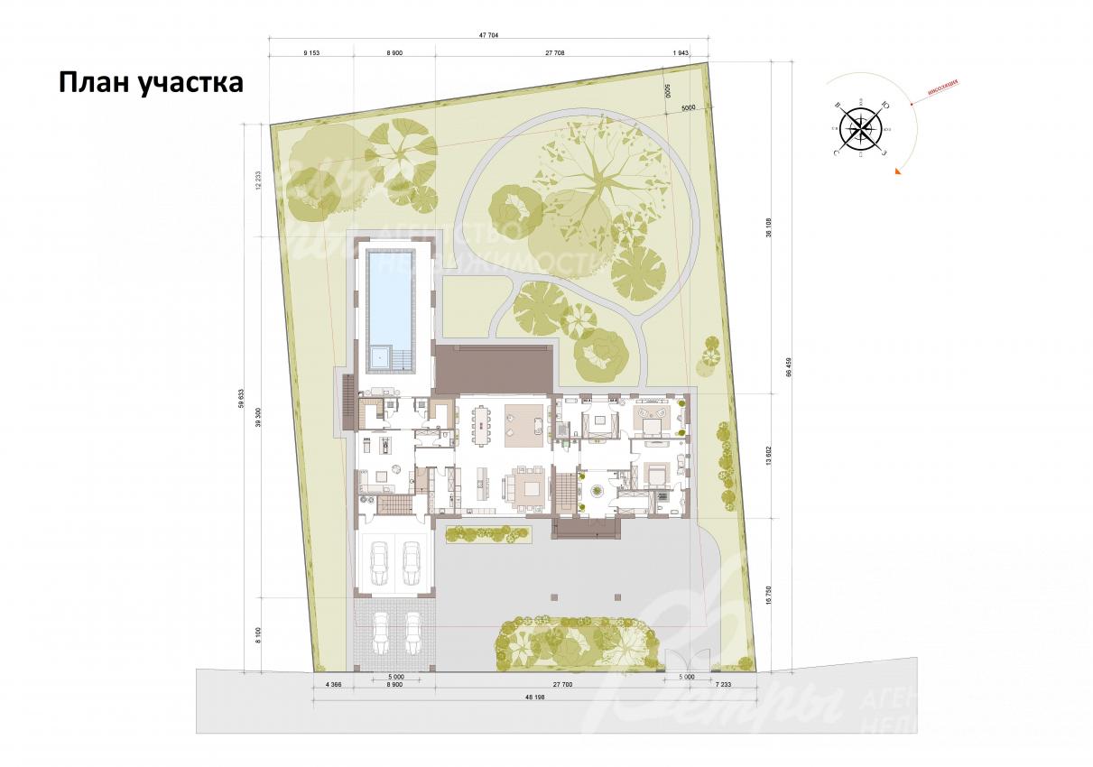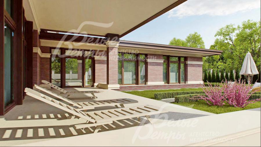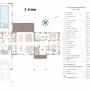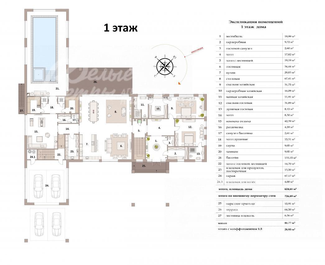 1-ый этаж: вестибюль 20 кв.м с гардеробной 10 кв.м и с гостевым санузлом 3 кв.м, гостиная 34 кв.м, объединенная с кухней 30 кв.м и столовой 67 кв.м, с выходом на террасу 65 кв.м, главная спальня 32 кв.м с гардеробной 16 кв.м и с санузлом (проход через гардеробную) 12 кв.м, гостевая спальня 32 кв.м с санузлом 8 кв.м, холл 8 кв.м, СПА зона - комната отдыха 42 кв.м со спортзалом, раздевалка 5 кв.м с гостевым санузлом 3 кв.м, холл с душевыми 15 кв.м, сауна 9 кв.м, хамам 9 кв.м, зона бассейна 133 кв.м с чашей бассейна 10х4,5 м и выходом на террасу, постирочная 14 кв.м, гараж 67 кв.м с кладовой 4 кв.м, холл 18 кв.м, лестничный холл 19 кв.м, крыльцо под навесом 16 кв.м,