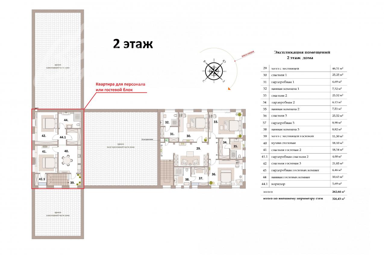 2-ой этаж: спальня 25 кв.м с санузлом 7 кв.м и с гардеробной 7 кв.м, спальня 26 кв.м с санузлом 8 кв.м и гардеробной 6 кв.м, спальня 26 кв.м с санузлом 9 кв.м и гардеробной 9 кв.м, холл 46 кв.м.