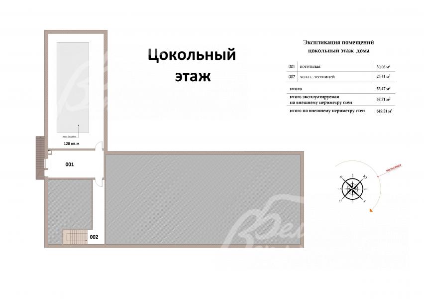 Цоколь: тех.помещение с бассейном 128 кв.м, котельная 30 кв.м с отдельным входом с улицы, лестничный холл 23 кв.м.