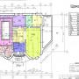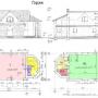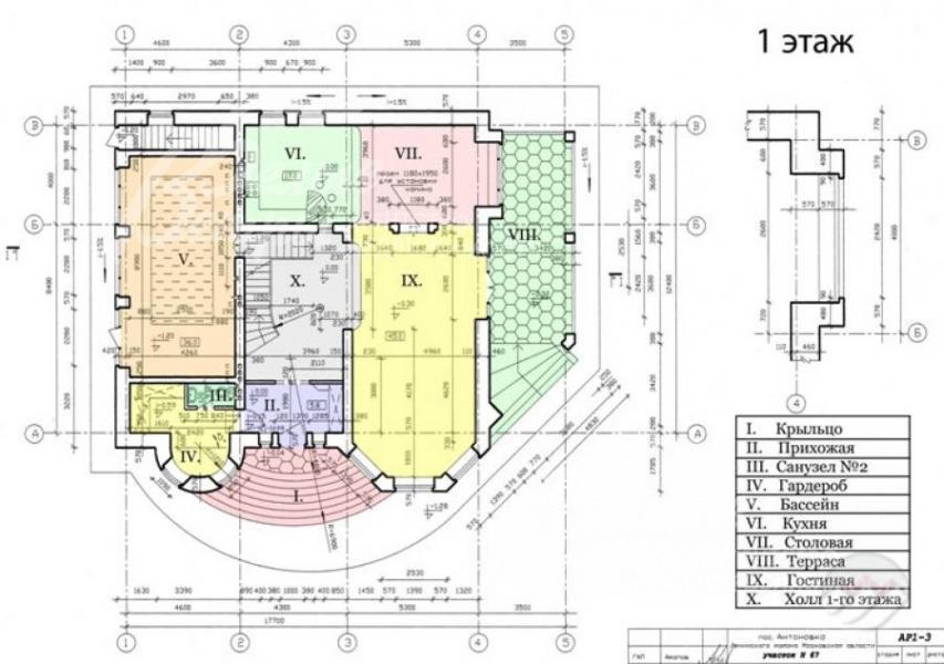 1-ый этаж: полукруглое крыльцо, прихожая 5.8 кв.м, гардероб 8 кв.м, гостевой с/узел, холл 24 кв.м, двухсветная (потолки 7м) гостиная 45 кв.м, столовая 20 кв.м, кухня 17 кв.м, терраса 38 кв.м, бассейн 36 кв.м (чаша бассейна 6*2.5м глубиной 1.6-2.2м)