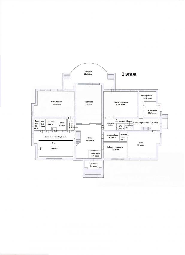 входная группа: тамбур 13 кв.м, холл 42 кв.м, гардеробная 8 кв.м, гостевой с/узел, кухня-столовая с мангалом 48 кв.м и выходом на террасу и участок, двухсветная гостиная с камином 53 кв.м и выходом на террасу 16.6 кв.м, кабинет 21 кв.м, бильярдная 54 кв.м с выходом на террасу; котельная 12.7 кв.м, постирочная 8.7 кв.м.