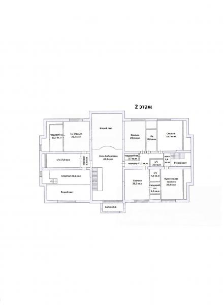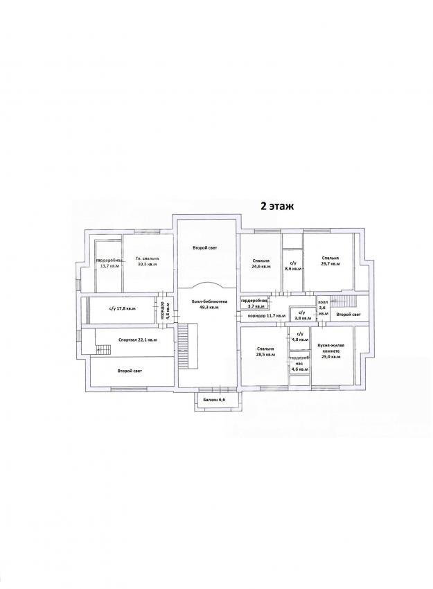 2-ой этаж: холл-галерея 49 кв.м, хозяйская спальня 32.6 кв.м с гардеробной 13 кв.м и с/узлом 18 кв.м, спальня 29 кв.м с гардеробной и с/узлом, две спальни 29 и 25 кв.м, с/узел 9 кв.м.