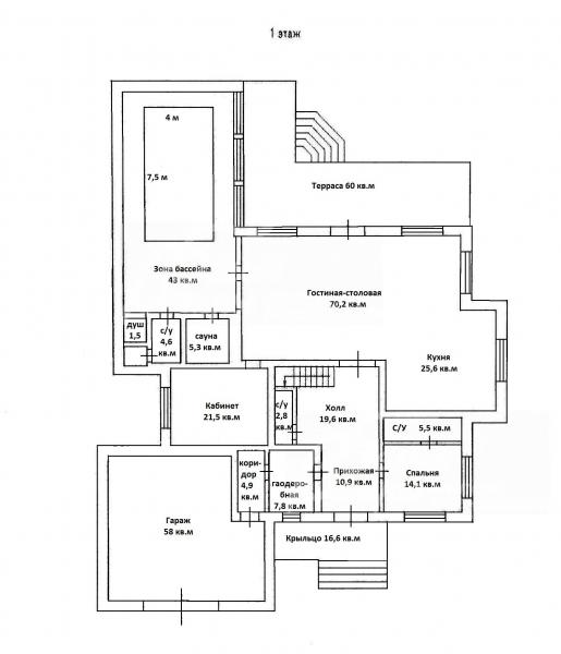 1-ый этаж: Крыльцо 16.6 кв.м, холл 19.6 кв.м, гардеробная 8 кв.м ( проход из гаража в холл дома), с/узел, гостевая спальня 14 кв.м с с/узлом 5.5 кв.м, кухня 25.6 кв.м, гостиная-столовая 70 кв.м с выходом на террасу 60 кв.м, кабинет 21.5 кв.м, зона отдыха: бассейн 43 кв.м (чаша 6.7 м Х 3.5 м глубиной 1.5-2.1 м) с противотоком, гидромассажем и подсветкой, сауна 5 кв.м, с/узел, душевая; тамбур-гардероб 5 кв.м (проход из гаража в холл дома), гараж 58 кв.м
