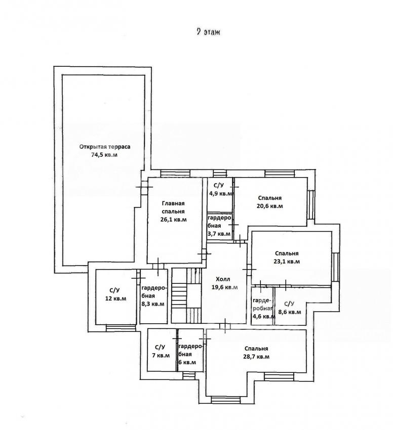 2-ой этаж: Холл 19.6 кв.м, главная спальня 26 кв.м с гардеробной 8 кв.м и с/узлом (вход через гардеробную) 12 кв.м и выходом на террасу 70 кв.м, спальня 21 кв.м с гардеробной и с/узлом 5 кв.м, спальня 23 кв.м с гардеробной и с/узлом 8.6 кв.м, спальня 28.7 кв.м с гардеробной 6 кв.м и с/у (вход через гардеробную) 7 кв.м