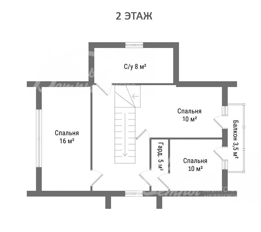 2-ой этаж: спальня 8 кв.м, спальня 8 кв.м, спальня 20 кв.м с выходом на балкон 3.5 кв.м, гардеробная 5 кв.м, санузел 8 кв.м