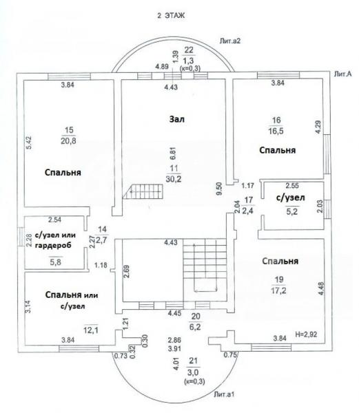 2-ой этаж: зал 30 кв.м с эркером и балконом, Главная спальня 21 кв.м со своим с/узлом 12 кв.м и гардеробной 6 кв.м, спальня 17 кв.м, спальня 16.5 кв.м, с/узел 5 кв.м, круглый балкон 10 кв.м