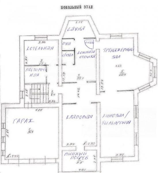 Цоколь: гараж 37 кв.м, кладовая 20 кв.м, винный погреб 10 кв.м, кинозал/бильярдная 30 кв.м, тренажерный зал 30 кв.м, комната отдыха 10 кв.м, с/узел, душевая, сауна, котельная 13 кв.м, постирочная