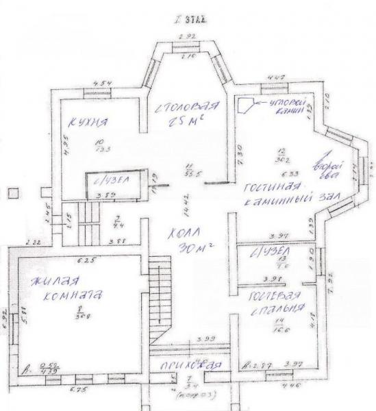 1-ый этаж: прихожая, холл 30 кв.м, кухня 19 кв.м, столовая 25 кв.м, с/узел, жилая комната 37 кв.м, каминный зал 36 кв.м со вторым светом, гостевая спальня 17 кв.м с с/узлом 8 кв.м