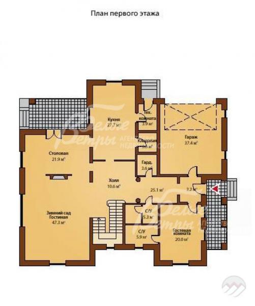 1-ый этаж: тамбур 3 кв.м, прихожая 25 кв.м, гардеробная 4 кв.м, гостевой с/узел 5 кв.м, холл 11 кв.м, кухня 28 кв.м, кладовая 3.5 кв.м, тех.помещение 4 кв.м с выходом на участок, столовая 22 кв.м, гостиная - зимний сад 47 кв.м, гостевая комната/спальня 20 кв.м с с/узлом 6 кв.м; гараж 37 кв.м