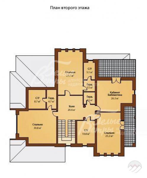2-ой этаж: холл 20 кв.м, спальня хозяев 31 кв.м с гардеробной 5 кв.м и с/узлом 9 кв.м, спальня 28 кв.м с гардеробной 3.5 кв.м и с/узлом 5 кв.м, кабинет/библиотека 26 кв.м с выходом на балкон, спальня 25 кв.м с балконом, гардаробная 3.5 кв.м, с/узел 11 кв.м