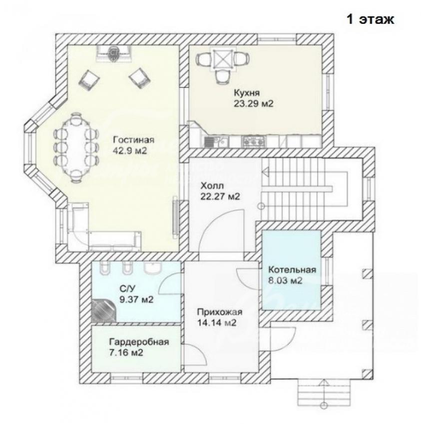 1-ый этаж: прихожая 14 кв.м, гардеробная 7 кв.м, гостевой с/узел 9 кв.м, холл 22 кв.м, кухня 23 кв.м, гостиная-столовая 43 кв.м, котельная