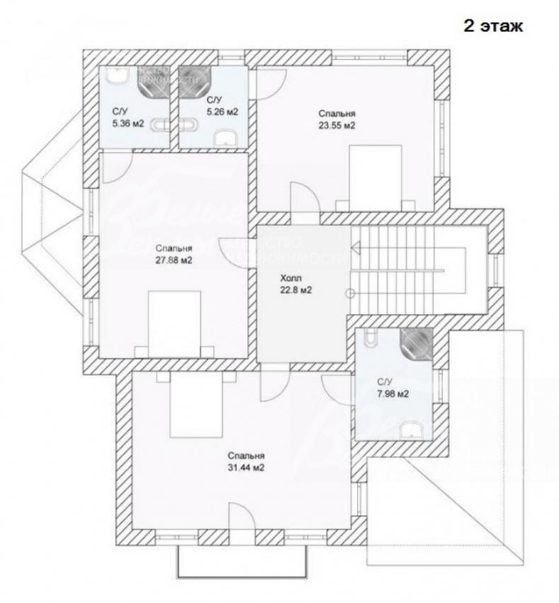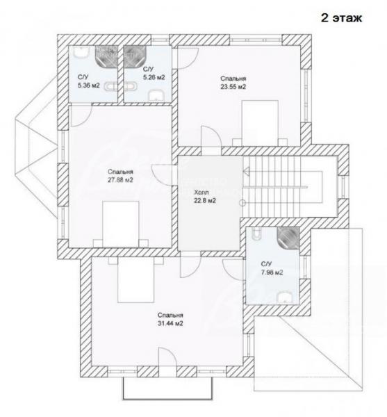 2-ой этаж: холл 23 кв.м, главная спальня 31 кв.м с с/узлом 8 кв.м и выходом на балкон, 2 спальни 23.5 кв.м и 28 кв.м со своими с/узлами по 5 кв.м