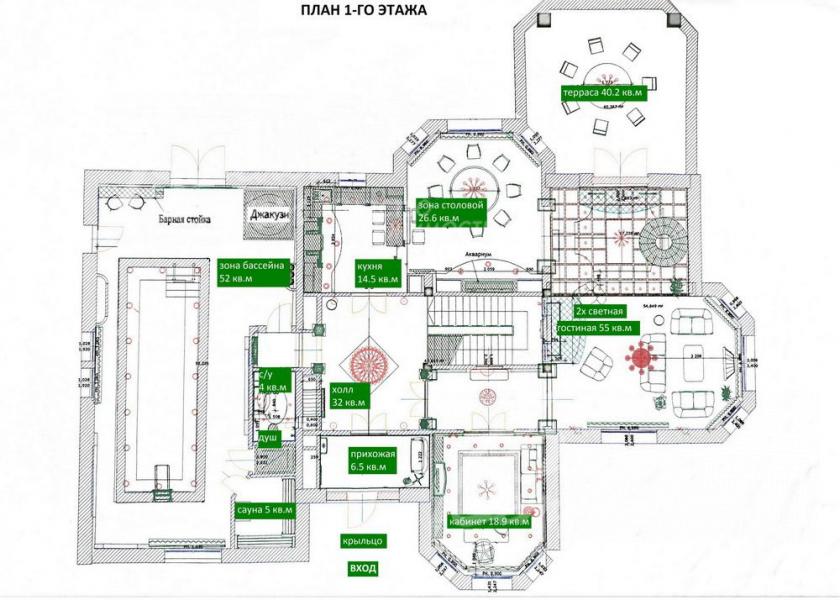 1-ый этаж: гостиная двухсветная (высотой 7.5 м, с окнами 6 м) 55 кв.м, столовая 29 кв.м, кухня 14 кв.м, санузел 4 кв.м, кабинет/спальня 19 кв.м, зона бассейна 52 кв.м с сауной 5 кв.м, холл 32 кв.м, прихожая 8 кв.м, крыльцо 8 кв.м, терраса 40 кв.м;