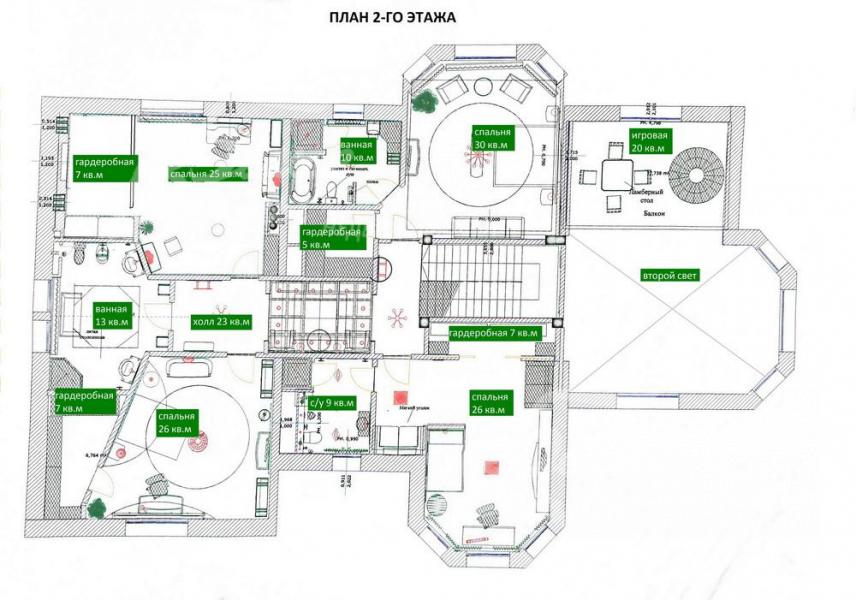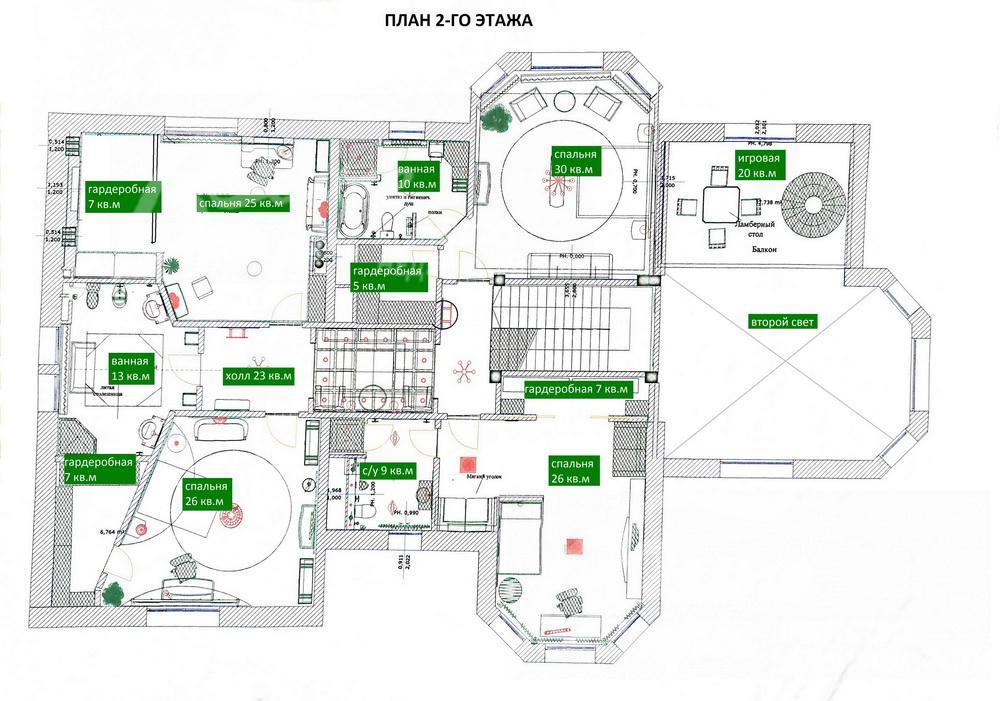 2-ой этаж: спальня 30 кв.м с гардеробной 5 кв.м и санузлом с ванной 10 кв.м, спальня 26 кв.м с гардеробной 7 кв.м и санузлом с ванной 9 кв.м, спальня 25 кв.м с гардеробной 7 кв.м, спальня 25 кв.м с гардеробной 7 кв.м, холл 23 кв.м, санузел 13 кв.м;