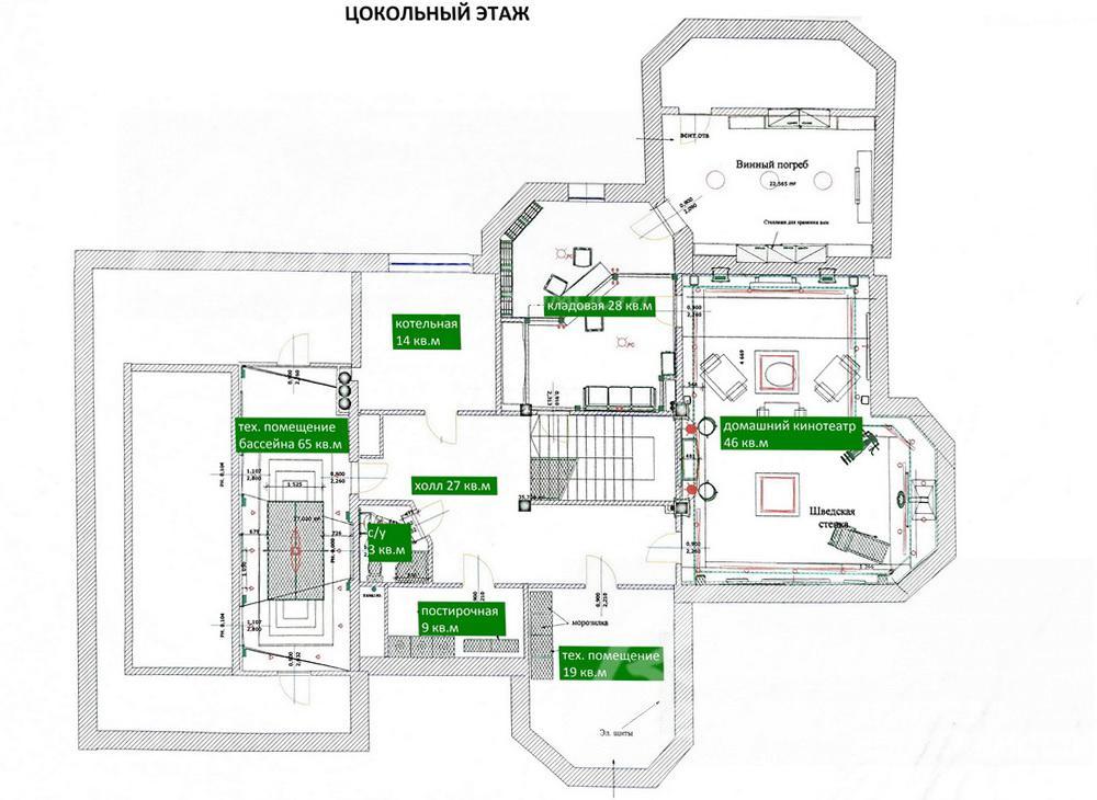 Цоколь: котельная 14 кв.м, кладовая 28 кв.м, домашний кинотеатр 46 кв.м, холл 27 кв.м, санузел 3 кв.м, постирочная 9 кв.м, помещение свободного назначения 19 кв.м, тех. помещение бассейна 65 кв.м;
