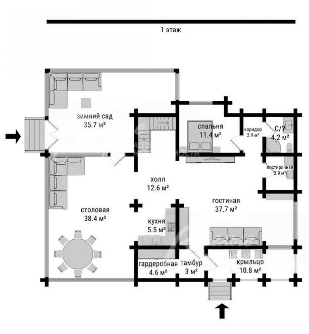 1-ый этаж: прихожая 8 кв.м с гардеробной, гостиная 38 кв.м, холл 13 кв.м, кухня-столовая 44 кв.м, коридор 3 кв.м, постирочная 4 кв.м, санузел 4 кв.м с душем, спальня 11 кв.м.