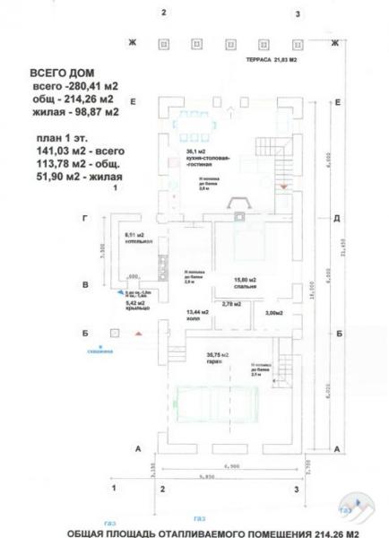 1-ый этаж: крыльцо, прихожая-холл 13 кв.м, кухня-столовая-гостиная 36 кв.м с камином и выходом на веранду 22 кв.м, спальня 16 кв.м со своим с/узлом 3 кв.м, общий с/узел 3 кв.м; теплый гараж 36 кв.м, котельная (с отдельным входом)