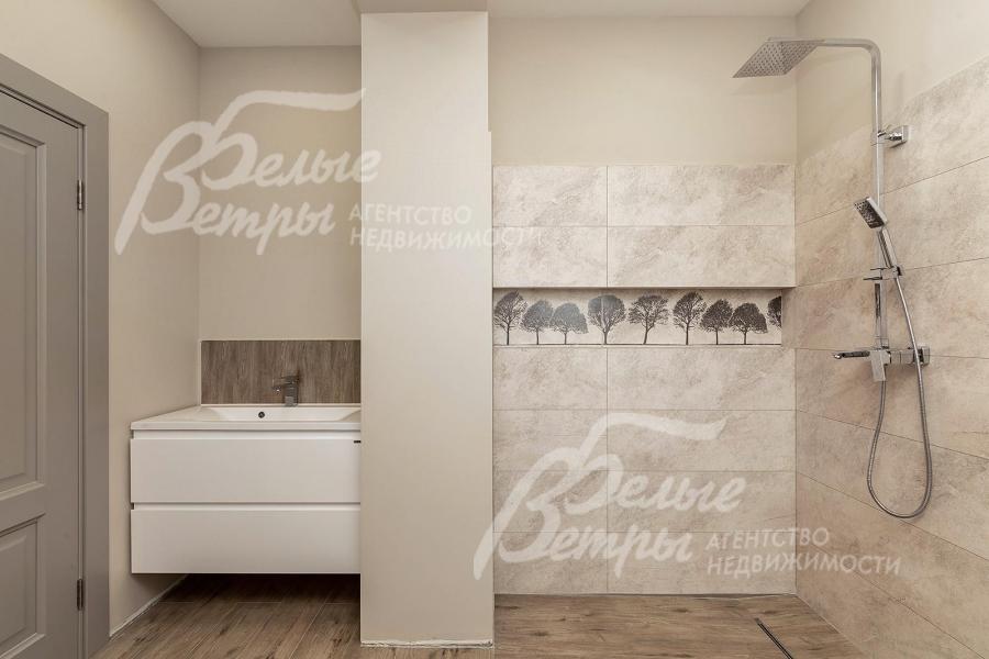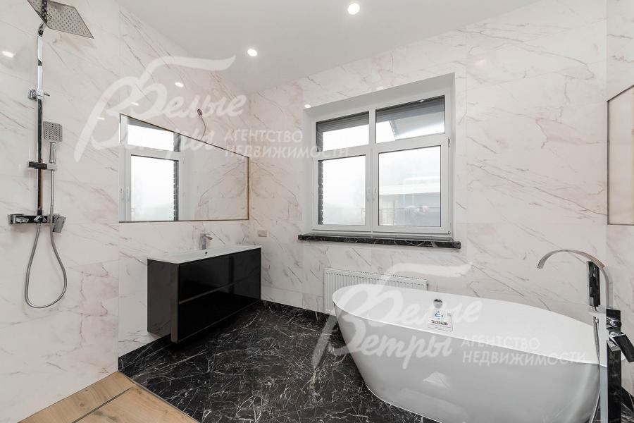 Описание внутренней отделки: выполнена дизайнерская отделка под ключ в светлых тонах с использованием дорогих отделочных материалов европейских производителей. Стены окрашены + декоративная штукатурка. В отделке санузлов использована крупноформатная плитка 120*60. На полу паркетная доска премиум-класса, керамогранит. Широкая ж/б лестница с подсветкой, ступени отделаны керамогранитом. Потолки ГКЛ со встроенным освещением и дизайнерскими светильниками. Установлена сантехника и смесители европейского качества (Hansgrohe, GROHE adianme, kirovit, aquanet ванна из литьевого мрамора Estet). Межкомнатные двери МДФ Оникс серого цвета высотой 2м с качественной фурнитурой. Подоконники из белого мрамора.