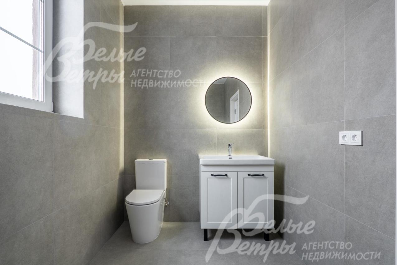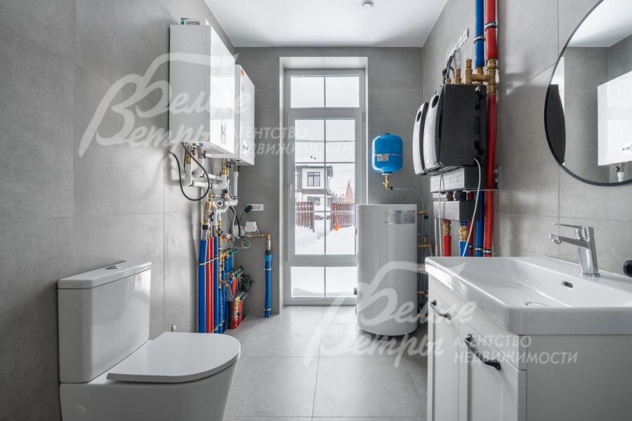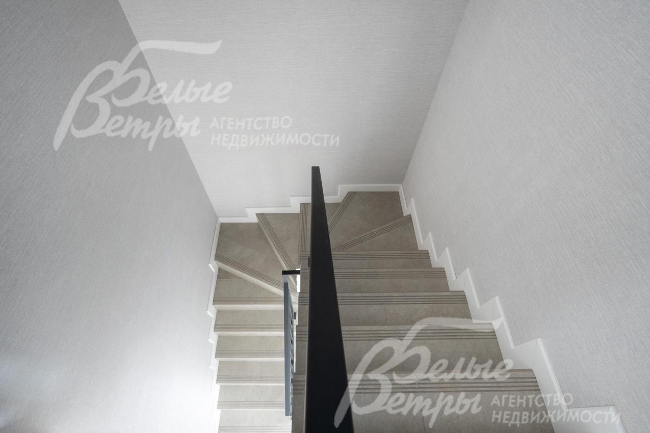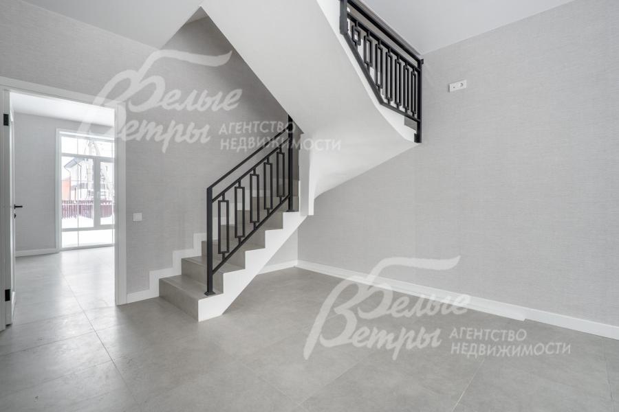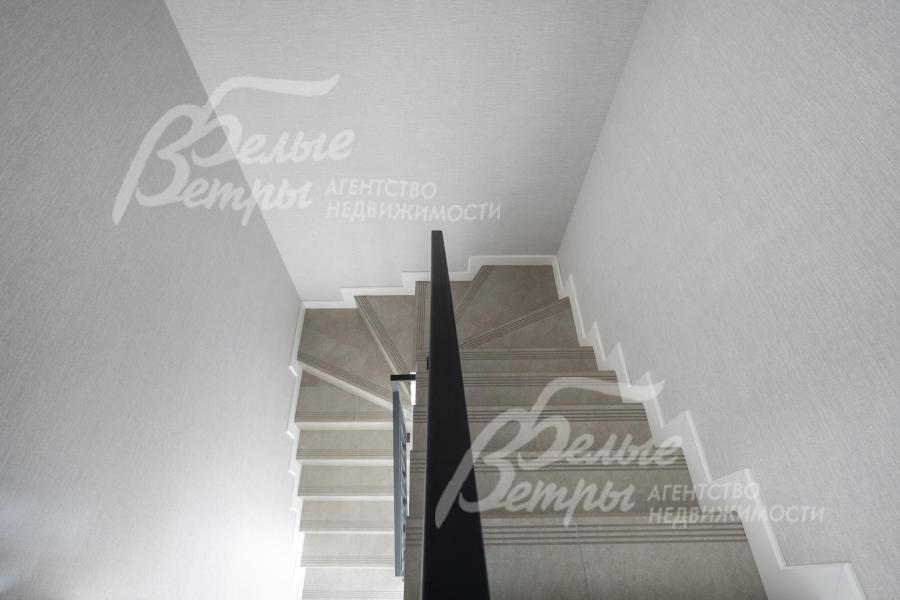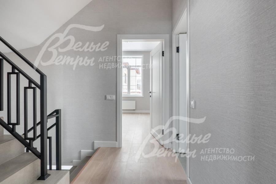 Описание внутренней отделки: на стенах поклеены обои флизелиновые, зарубежные. Разведен водяной теплый пол, отделка пола - качественный ламинат на 1 этаже, в санузлах - керамогранит Kerama marazzi. Лестница на монолитном основании шириной 1 метр, ступени отделаны керамогранитом Kerama marazzi, ограждение - ковка. Натяжные потолки. Установлена сантехника: ванная Reimar, раковина Sanita Luxe, инсталляции Grohe. Установлены радиаторы Kermi. Деревянные межкомнатные двери, производитель ALBERO.
