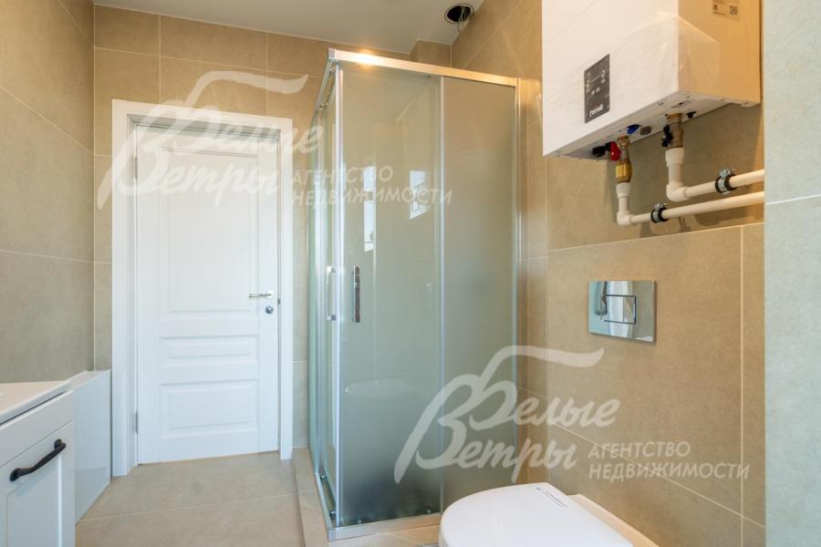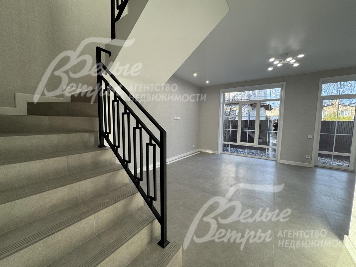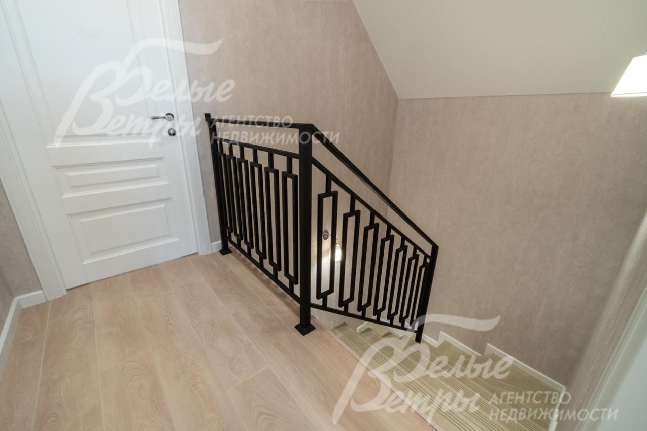 Описание внутренней отделки: на стенах поклеены обои флизелиновые, зарубежные. Разведен водяной теплый пол, отделка пола - качественный ламинат на 1 этаже, в санузлах - керамогранит Kerama marazzi. Лестница на монолитном основании шириной 1 метр, ступени отделаны керамогранитом Kerama marazzi, ограждение - ковка. Натяжные потолки. Установлена сантехника: ванная Reimar, раковина Sanita Luxe, инсталляции Grohe. Установлены радиаторы Kermi. Деревянные межкомнатные двери, производитель ALBERO.