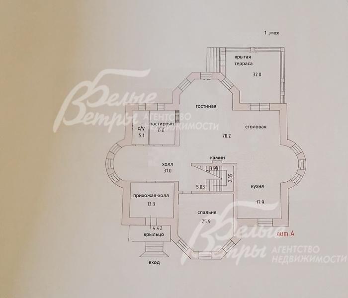 1-ый этаж: гостиная с камином и зоной столовой 70 кв.м, кухня 14 кв.м, спальня 26 кв.м, крытая терраса 32 кв.м, крыльцо 4 кв.м, холл-прихожая 13 кв.м,холл 31 кв.м, санузел 5 кв.м, постирочная 8 кв.м;