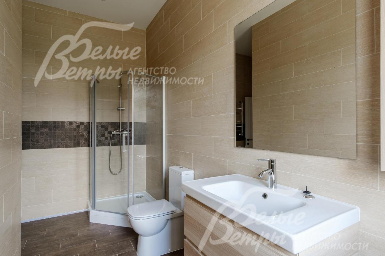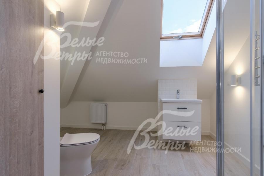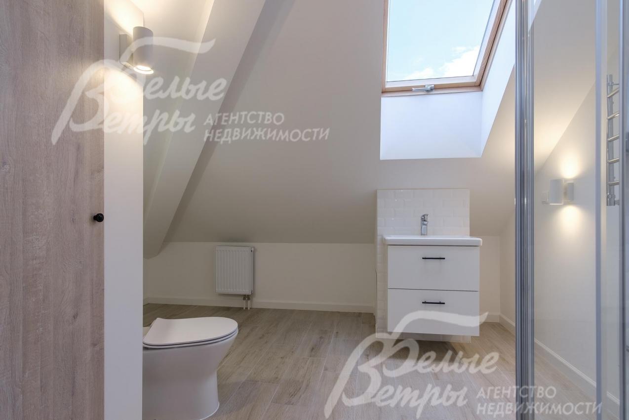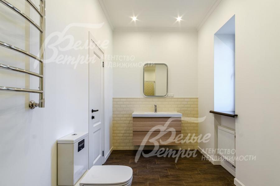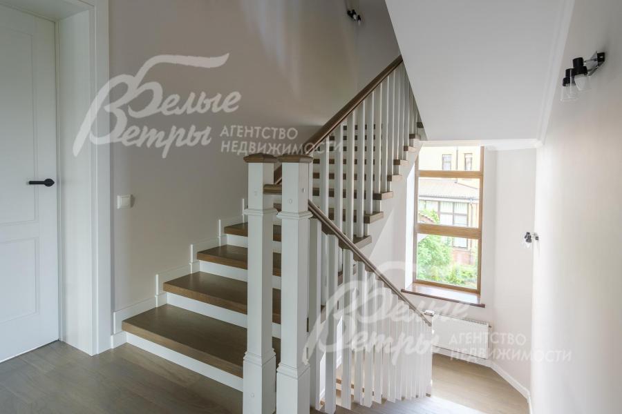 Описание внутренней отделки: выполненная современная отделка в светлых тонах. Стены окрашены, в санузлах - частично плитка. На полу паркетная доска, в санузлах - плитка. Потолки подвесные со встроенным освещением. Лестница ж/б со ступенями и поручнями из массива. Межкомнатные двери белого цвета с качественной контрастной фурнитурой.