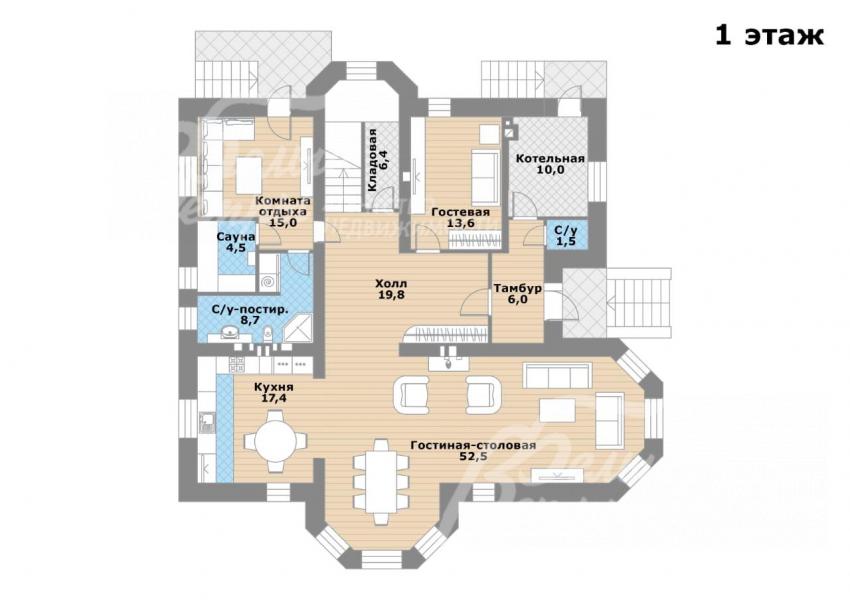 1-ый этаж: кухня-столовая-гостиная с камином общей площадью 70 кв.м, сауна с комнатой отдыха, санузел-постирочная, гостевая спальня 14 кв.м,