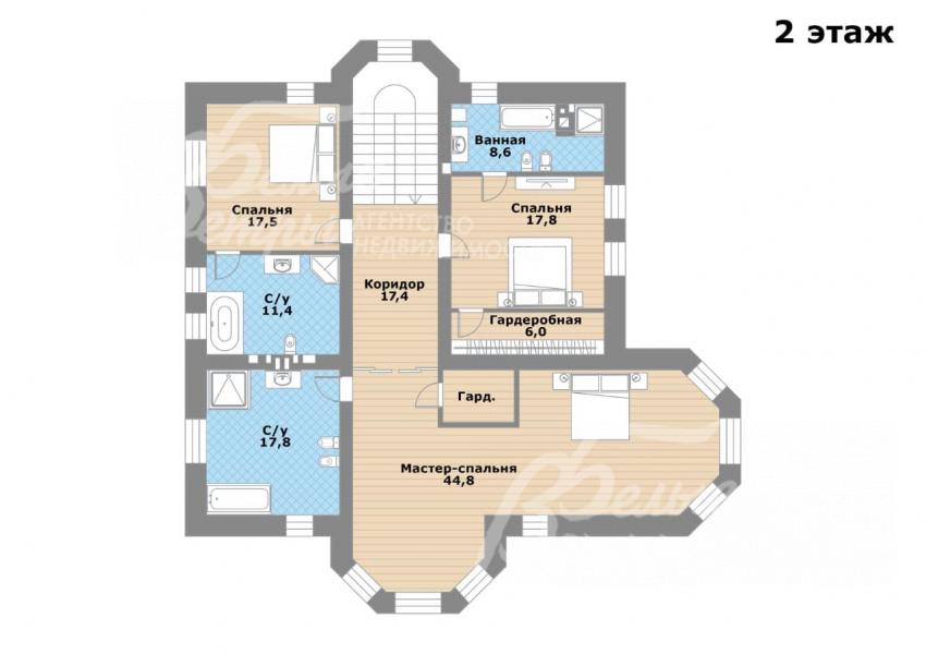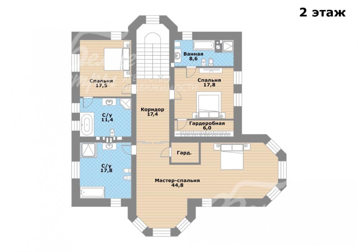 2-ой этаж: спальня 18 кв.м с ванной комнатой 9 кв.м, спальня 18 кв.м с ванной комнатой 12 кв.м, спальня 45 кв.м с гардеробной и ванной комнатой 17 кв.м.