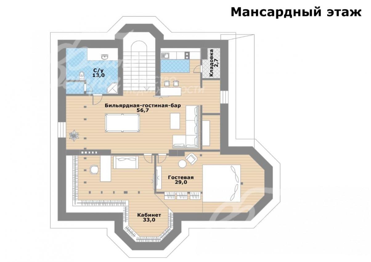 3-ий этаж: бильярдная 57 кв.м с мини-кухней, две гостевые спальни по 30 кв.м каждая, санузел 13 кв.м.