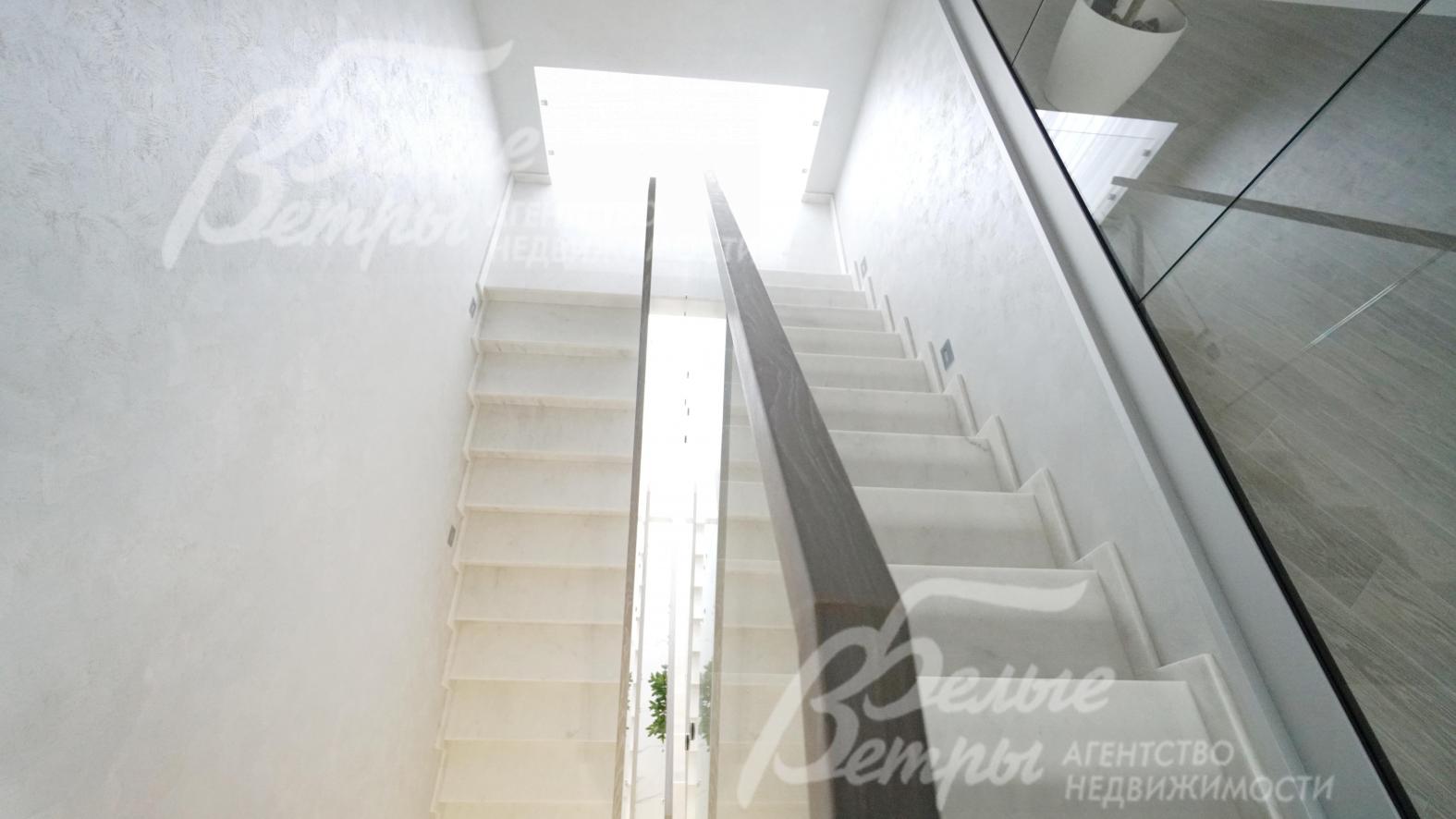 (20) Железобетонная лестница с отделкой ступеней мрамором, стеклянным ограждением и дубовым поручнем